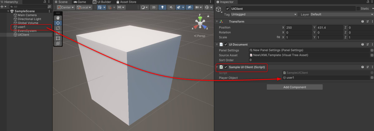 将上述脚本附加到场景中存在的 UI 文档所附加的游戏对象(下例中的 UIClient),并将您之前创建的 user1 分配给玩家对象。