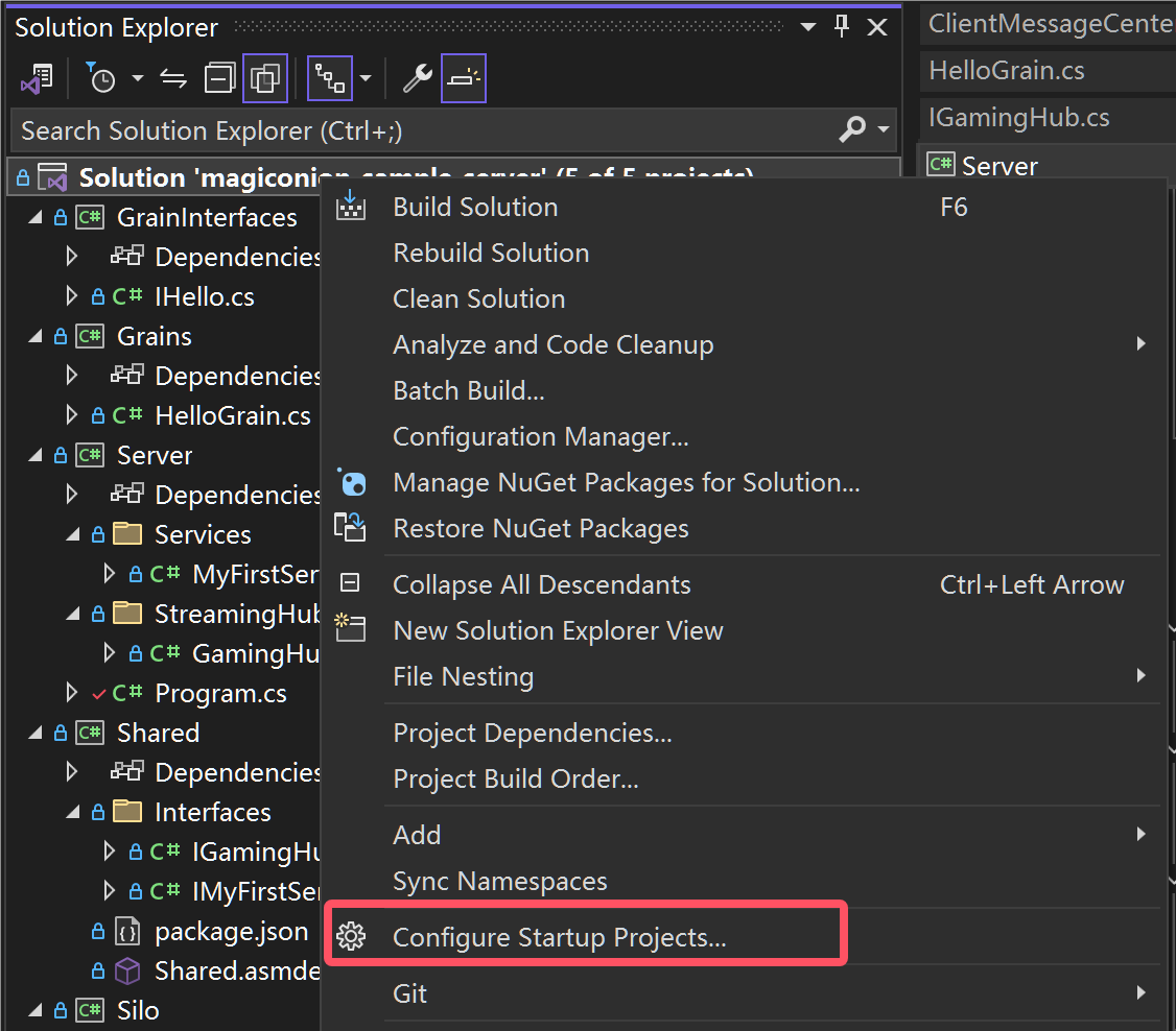 这里为什么没有创建 Client,因为 MagicOnion 的 Server 就作为 Orleans 的 Client