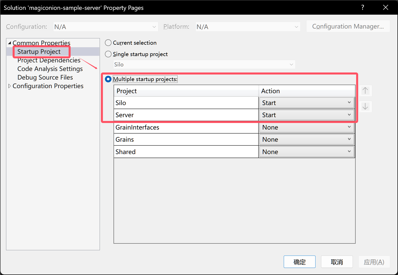 修改 Grains/Grains.csproj 将 GrainInterfaces.csproj 加入其中,